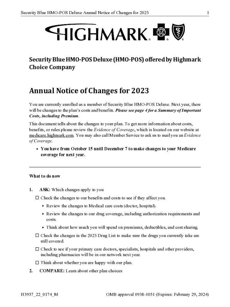 Security Blue HMO POS Deluxe Annual Notice of Changes for 20231Security Blue HMO POS Deluxe (HMO POS) offered by High mark Choice CompanyAnnual Notice of Changes for 2023 You are currently enrolled