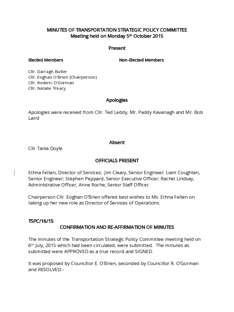 MINUTES OF TRANSPORTATION STRATEGIC POLICY COMMITTEE Meeting held on Monday 5th October 2015 Present Elected MembersNonElected MembersCllr. Darragh Butler Cllr. Eoghan OBrien (Chairperson) Cllr. Roderic OGorman Cllr. Natalie TreacyApologies Apologies were received from Cllr. Ted Leddy, Mr. Paddy Kavanagh and Mr. Bob LairdAbsent Cllr Tania Doyle OFFICIALS PRESENT Ethna Felten, Director of Services; Jim Cleary, Senior Engineer; Liam Coughlan, Senior Engineer; Stephen Peppard, Senior