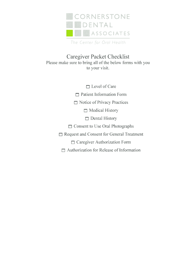 Caregiver Packet Checklist Please make sure to bring all the below forms with you to your visit. Level of Care Patient Information Form Notice of Privacy Practices Medical History Dental History Consent