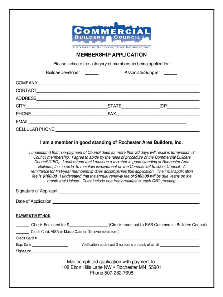 MEMBERSHIP APPLICATION Please indicate the category of membership being applied for: Builder/DeveloperAssociate/SupplierCOMPANY CONTACT ADDRESS CITYSTATEPHONEFAXZIPEMAIL CELLULAR PHONE am a member
