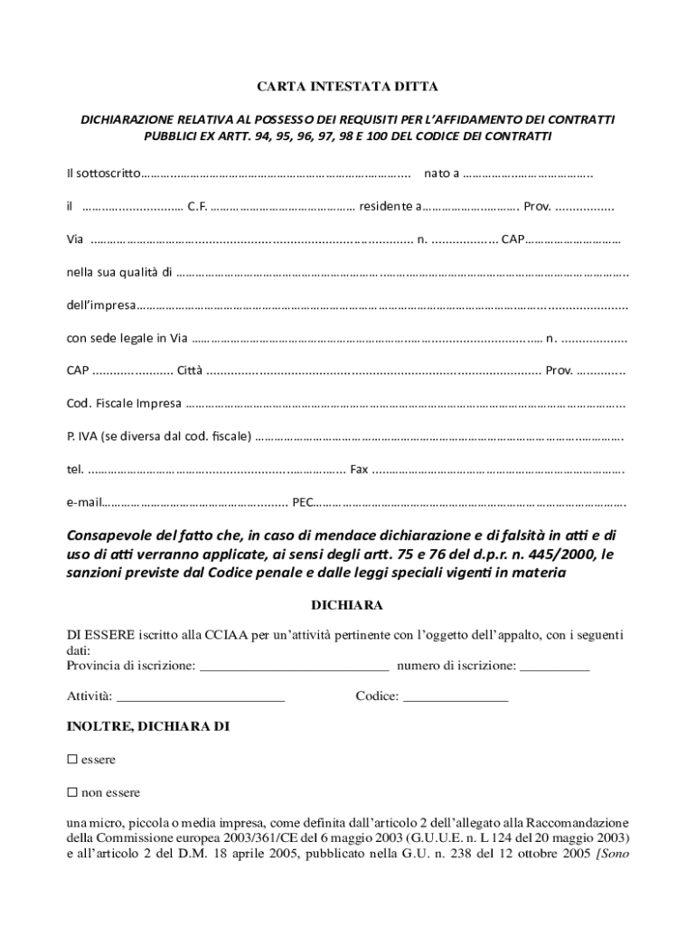 CARTA INTESTATE DICTA DICHIARAZIONE RELATIVE AL POSSESS DEI REQUISITE PER LAFFIDAMENTO DEI CONTRA TTI PUBLIC EX ART. 94, 95, 96, 97, 98 E 100 DEL CODICES DEI CONTRA TTI IL sottoscritto........ NATO