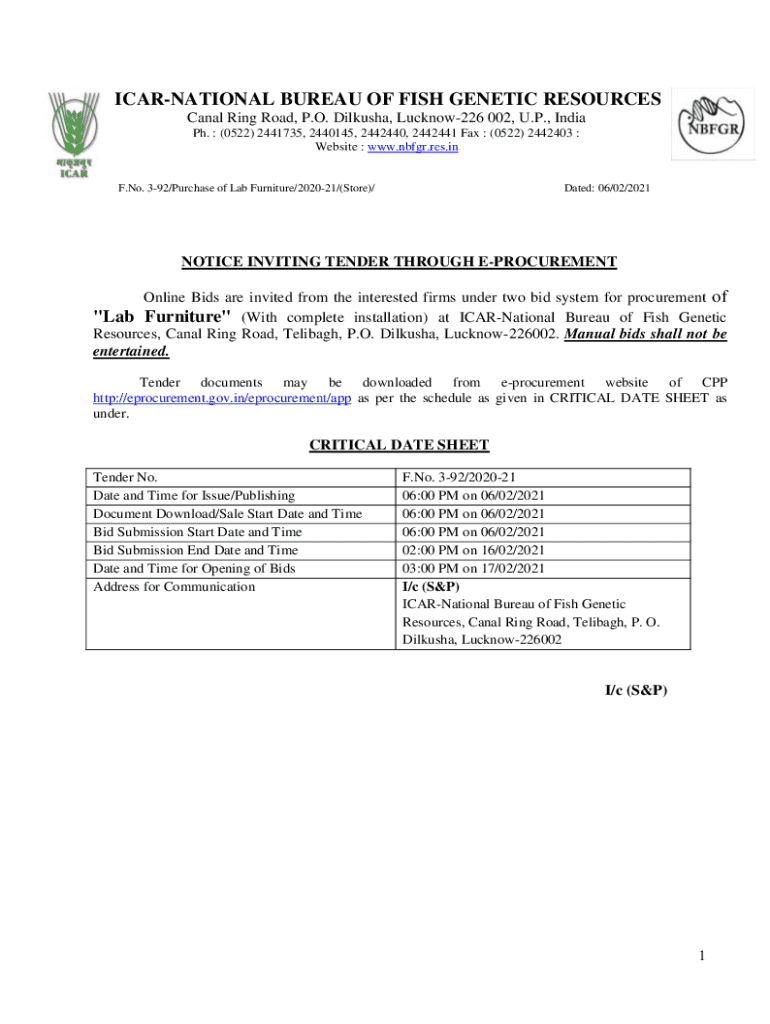 ICARNATIONAL BUREAU OF FISH GENETIC RESOURCES Canal Ring Road, P.O. Dilkusha, Lucknow226 002, U.P., India Ph. : (0522) 2441735, 2440145, 2442440, 2442441 Fax : (0522) 2442403 : Website : www.nbfgr.res.inF.No. 392/Purchase of Lab Furniture/202021/(Store)/Dated: 06/02/2021NOTICE INVITING TENDER THROUGH EPROCUREMENT Online Bids are invited from the interested firms under two bid system for procurement of \"Lab Furniture\" (With complete installation) at ICARNational Bureau of Fish Genetic...