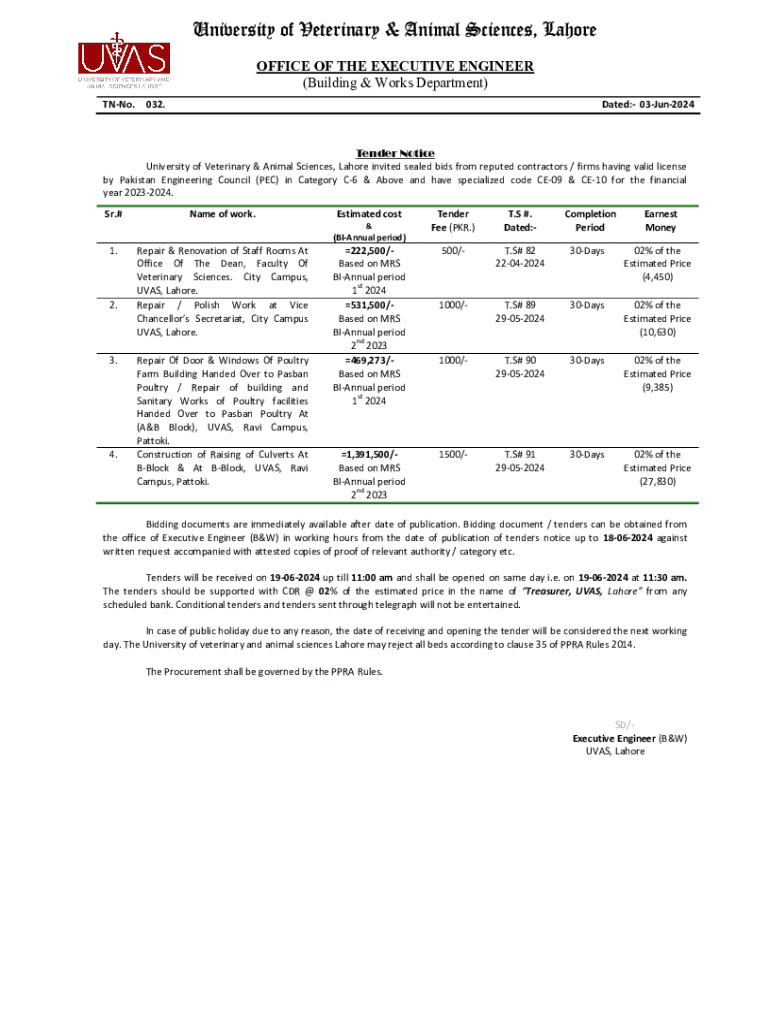 University of Veterinary & Animal Sciences, Lahore OFFICE OF THE EXECUTIVE ENGINEER (Building & Works Department) TNN.032. Dated: 03Jun2024Tender Notice University of Veterinary & Animal Sciences,