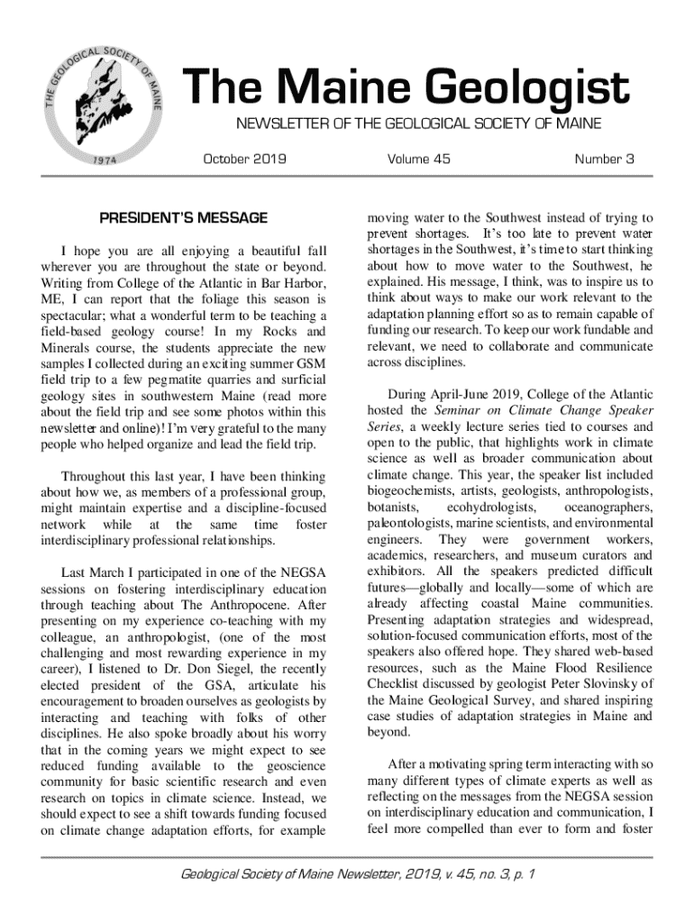 The Maine Geologist NEWSLETTER OF THE GEOLOGICAL SOCIETY OF MAINE October 2019PRESIDENTS MESSAGE I hope you are all enjoying a beautiful fall wherever you are throughout the state or beyond. Writing