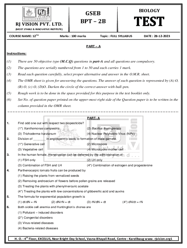 .RJ VISION PVT. LTD.BIOLOGYGSEB BPT 2B(MOST STABLE & INNOVATIVE INSTITUTE)COURSE NAME: 12THMarks : 100 marksTopic : FULL SYLLABUSDATE : 28122023PART AInstructions: (1)There are 50 objective type (M.C.Q) questions in partA and all questions are compulsory.(2)The questions are serially numbered from 1 to 50 and each carries 1 mark.(3)Read each question carefully, select proper alternative and answer in the O.M.R. sheet.(4)The OMR sheet is given for answering the questions