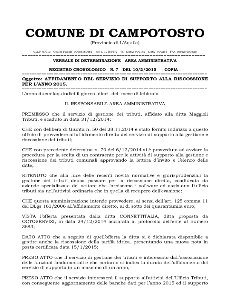 COMUNE DI CAMPOTOSTO (Provincia di LAquila) C.A.P. 67013 Codice Fiscale 00085160661 c.c.p. 12153672 Tel (0862) 900142 (0862) 900285 FAX (0862) 900320 VERBALE DI DETERMINAZIONEAREA AMMINISTRATIVAREGISTRO