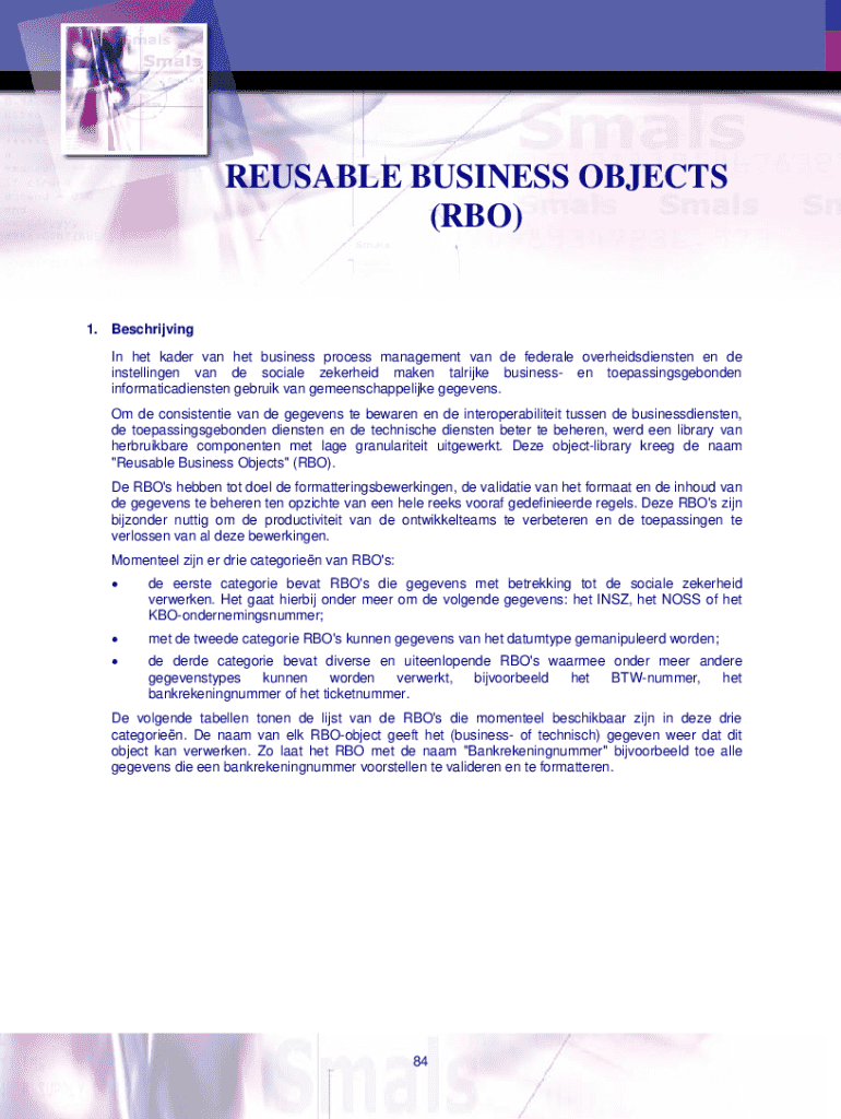 REUSABLE BUSINESS OBJECTS (RBO)1. Beschrijving In het kader van het business process management van de federale overheidsdiensten en de instellingen van de sociale zekerheid maken talrijke business