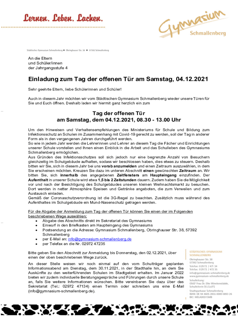 An die Eltern und Schler/innen der Jahrgangsstufe 4Einladung zum Tag der offenen Tr am Samstag, 04.12.2021 Sehr geehrte Eltern, liebe Schlerinnen und Schler! Auch in diesem Jahr mchten wir vom Stdtischen
