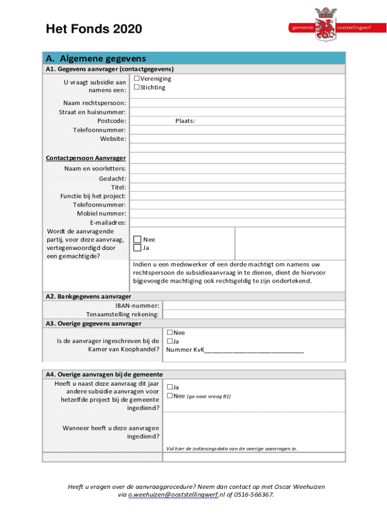 Het Fonds 2020Aanvraagformulier klein initiatief (tot en met 10.000,) Subsidieregeling Fonds 20182021Formulier retour sturen naar:Gemeente Ooststellingwerf t.a.v. het College van B&W Postbus 38 8430