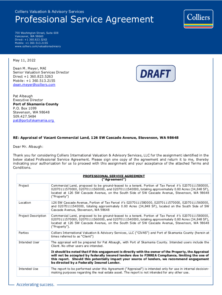 Colliers Valuation & Advisory ServicesProfessional Service Agreement 700 Washington Street, Suite 608 Vancouver, WA 98660 Direct: +1 360.823.5263 Mobile: +1 360.513.2155 www.colliers.com/valuationadvisoryMay 11, 2022 Dean M. Meyer, MAI Senior Valuation Services Director Direct +1 360.823.5263 Mobile: +1 360.513.2155 dean.meyer@colliers.com Pat Albaugh Executive Director Port of Skamania County P.O. Box 1099 Stevenson, WA 98648 509.427.5484 pat@portofskamania.orgRE: Appraisal of Vacant Commercial
