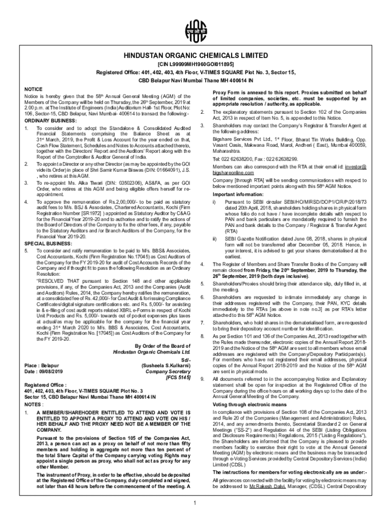 HINDUSTAN ORGANIC CHEMICALS LIMITED[IN L99999MH1960GOI011895] Registered Office: 401, 402, 403, 4th Floor, TIMES SQUARE Plot No. 3, Sector 15, CBD Belarus Navi Mumbai Thane MH 400614 IN NOTICE is