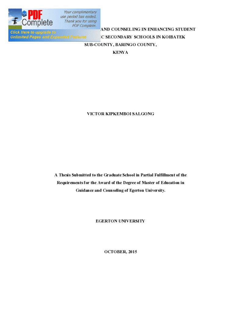 THE ROLE OF GUIDANCE AND COUNSELING IN ENHANCING STUDENT DISCIPLINE IN PUBLIC SECONDARY SCHOOLS IN KOIBATEK SUBCOUNTY, BARINGO COUNTY, KENYAVICTOR KIPKEMBOI SALGONGA Thesis Submitted to the Graduate