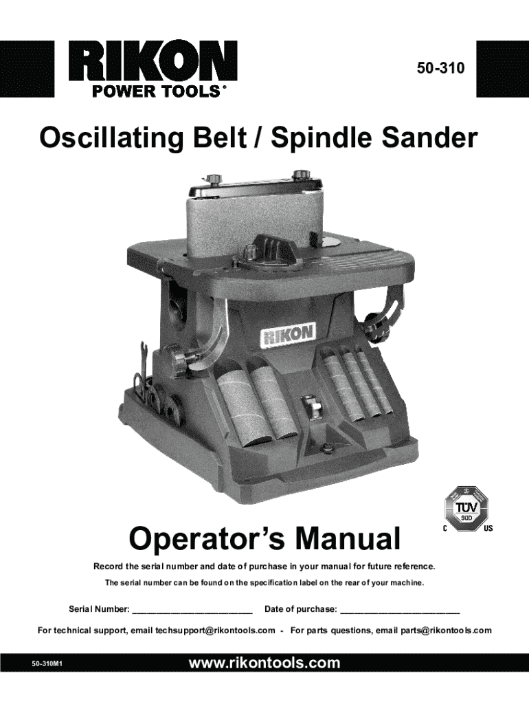 50310Oscillating Belt / Spindle SanderOperators ManualRecord the serial number and date of purchase in your manual for future reference. The serial number can be found on the specification label on the rear of your machine.Serial Number: ___Date of purchase: ___For technical support, email techsupport@rikontools.com For parts questions, email parts@rikontools.com 50310M1www.rikontools.comTABLE OF CONTENTS Specifications2 Safety Warnings36 Electrical