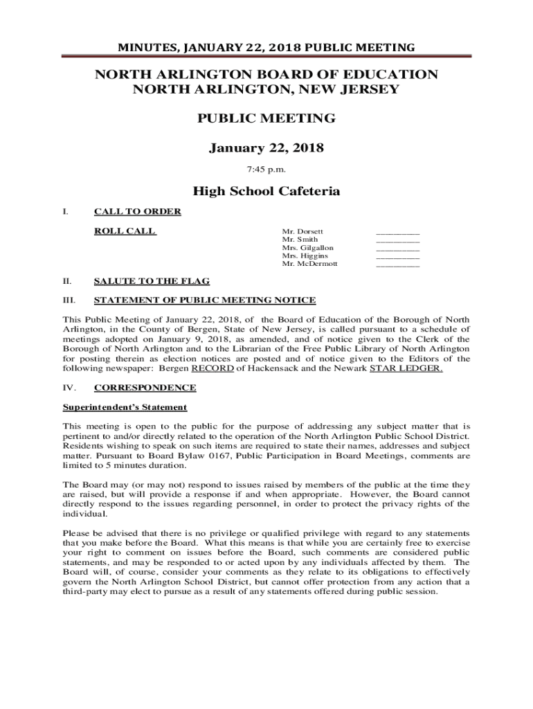 MINUTES, JANUARY 22, 2018, PUBLIC MEETINGNORTH ARLINGTON BOARD OF EDUCATION