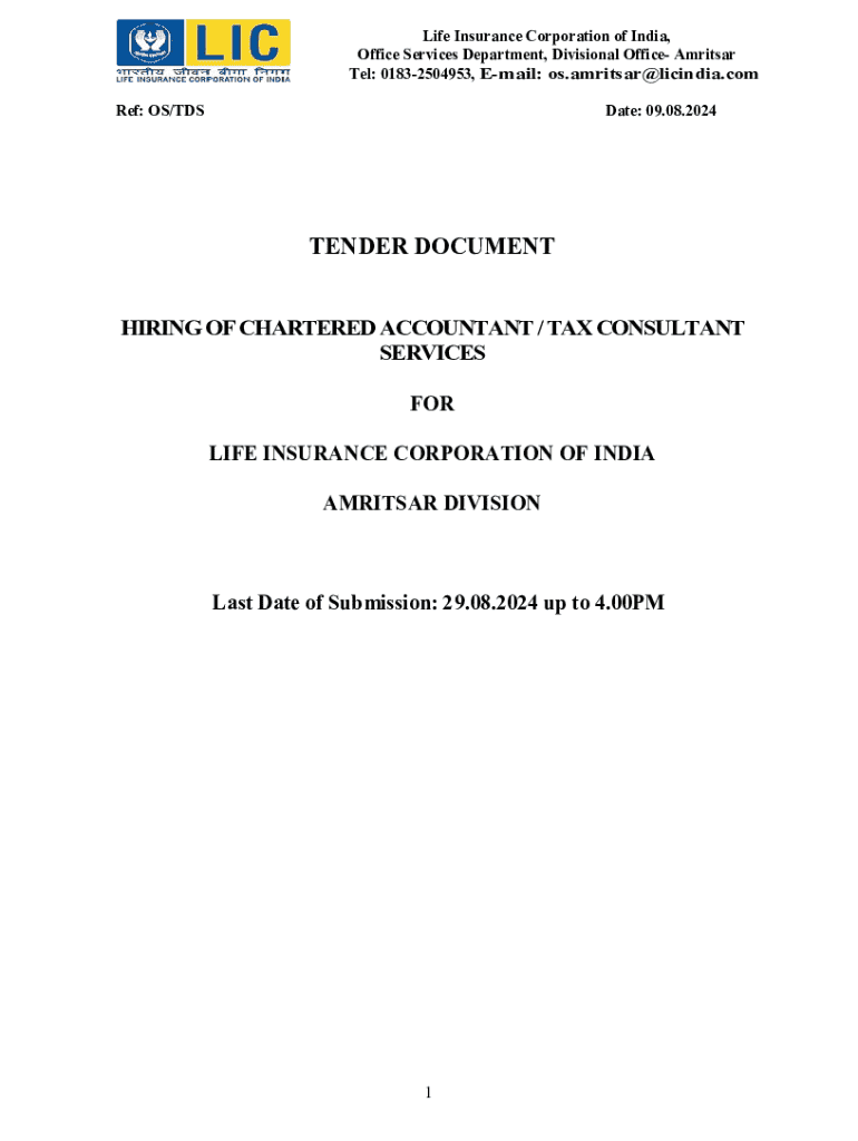 Life Insurance Corporation of India, Office Services Department, Divisional Office Amritsar Tel: 01832504953, Email: os.amritsar@licindia.com Ref: OS/TDSDate: 09.08.2024TENDER DOCUMENT HIRING OF CHARTERED ACCOUNTANT / TAX CONSULTANT SERVICES FOR LIFE INSURANCE CORPORATION OF INDIA AMRITSAR DIVISIONLast Date of Submission: 29.08.2024 up to 4.00PM1Life Insurance Corporation of India, Office Services Department, Divisional Office Amritsar Tel: 01832504953, Email: os.amritsar@licindia
