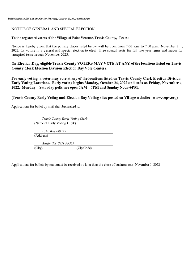 Public Notice to Hill County New for Thursday, October 20, 2022 publish dateNOTICE OF GENERAL AND SPECIAL ELECTION To the registered voters of the Village of Point Venture, Travis County, Texas: Notice