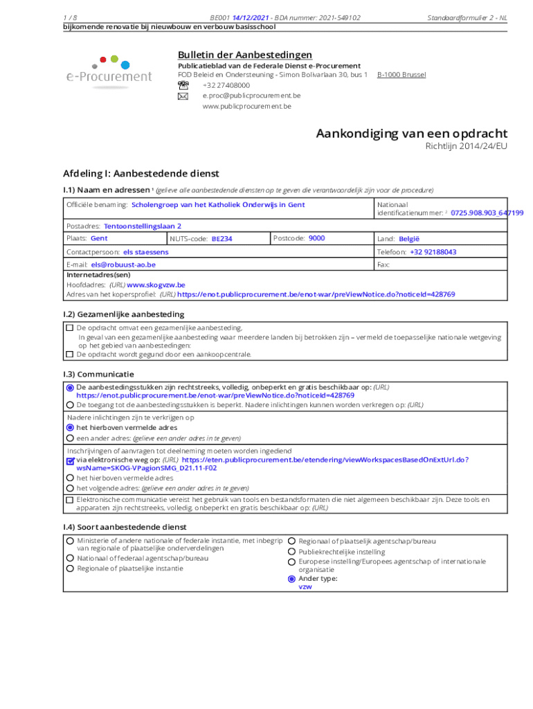 1/8 BE001 14/12/2021 BDA nummer: 2021549102 bijkomende renovatie bij nieuwbouw en verbouw basisschoolStandaardformulier 2 NLBulletin der Aanbestedingen Publicatieblad van de Federale Dienst eProcurement