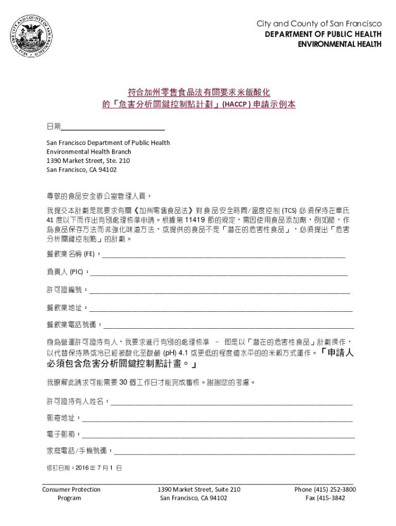 City and County of San Francisco DEPARTMENT OF PUBLIC HEALTH ENVIRONMENTAL HEALTH (HACCP) San Francisco Department of Public Health Environmental Health Branch 1390 Market Street, Ste. 210 San Francisco,
