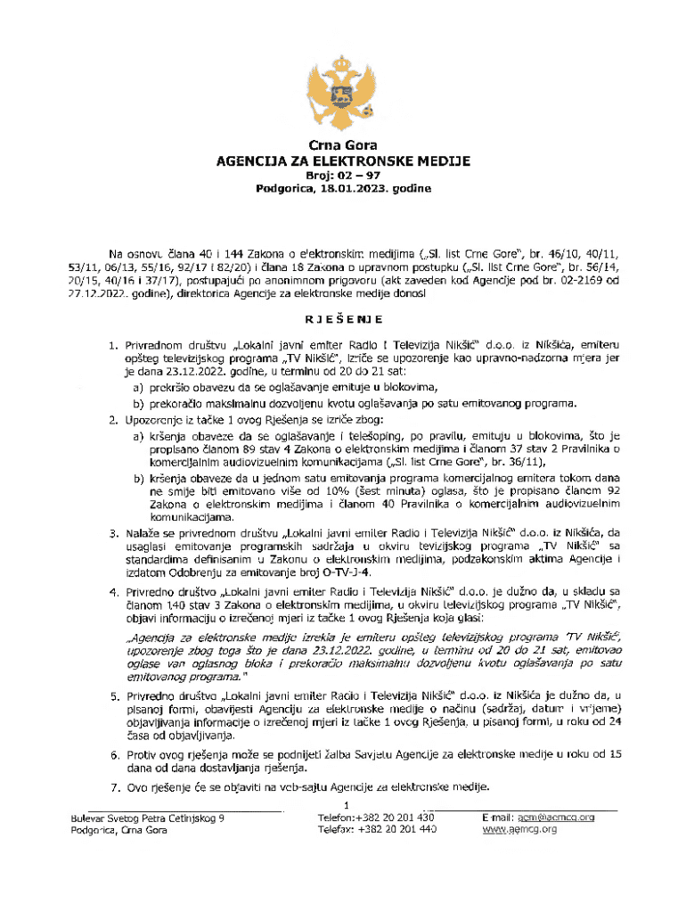 Get the free Upozorenje TV Niki 02-97 - Agencija za elektronske medije