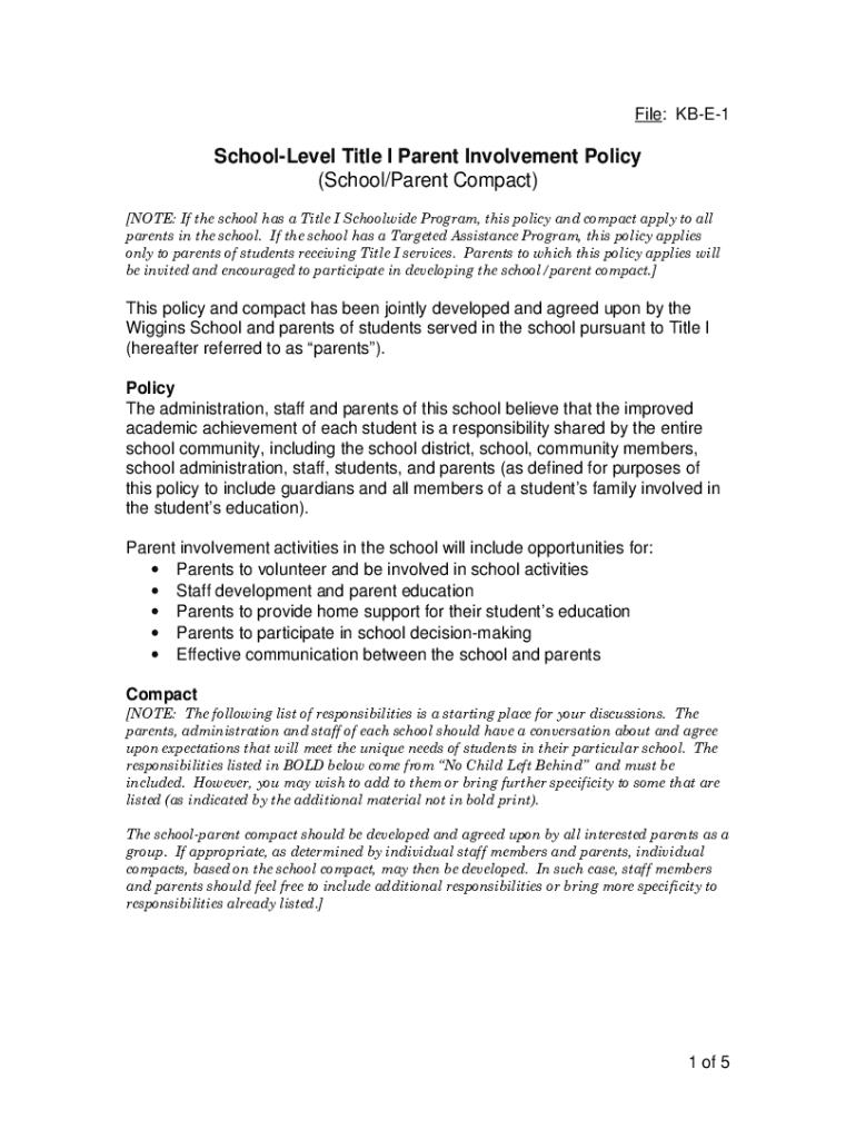 File: KBE1SchoolLevel Title I Parent Involvement Policy (School/Parent Compact) [NOTE: If the school has a Title I Schoolwide Program, this policy and compact apply to all parents in the school. If