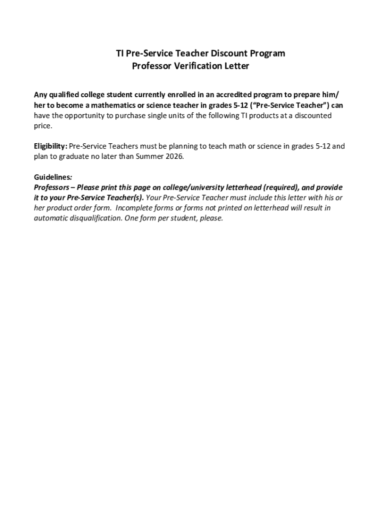 TI PreService Teacher Discount Program Professor Verification Letter Any qualified college student currently enrolled in an accredited program to prepare him/ her to become a mathematics or science