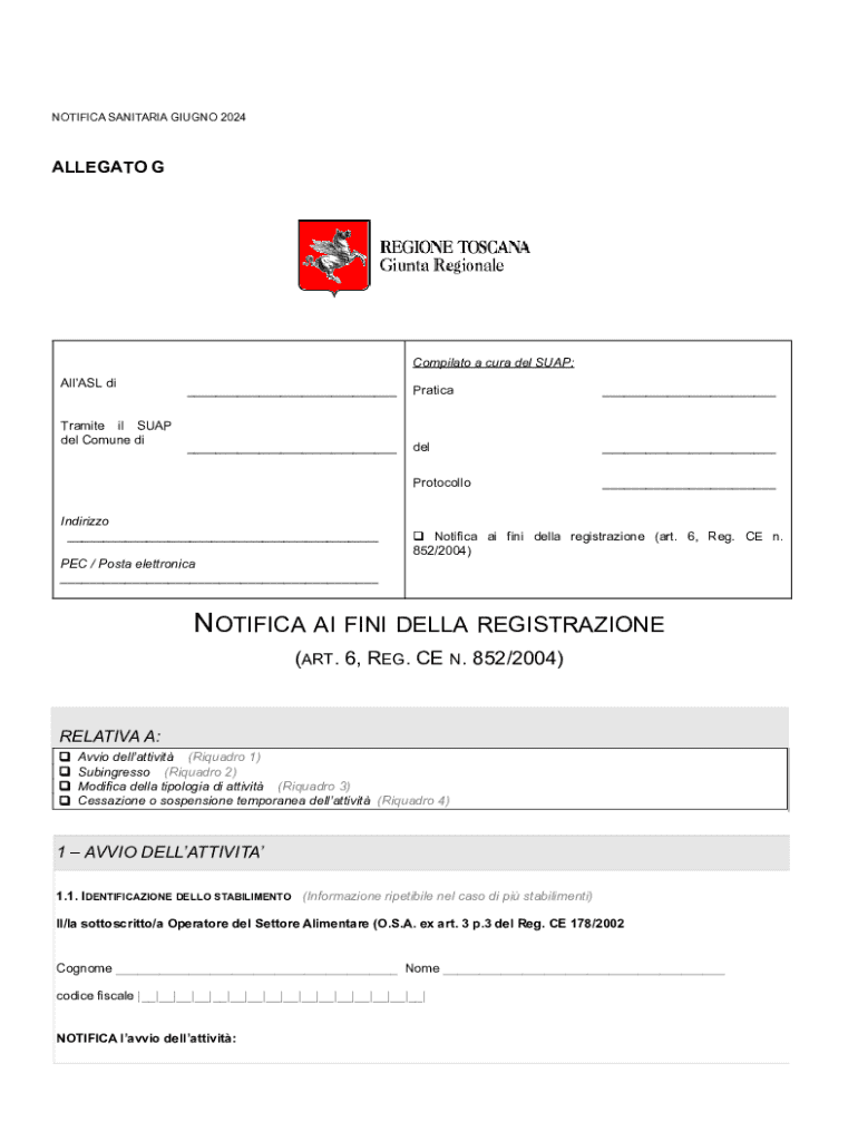 NOTIFICA SANITARIA GIUGNO 2024ALLEGATO GCompilato a cura del SUAP: AllASL di Tramite il SUAP del Comune di___Pratica______del___Protocollo___Indirizzo ___ PEC / Posta elettronica ___ Notifica ai fini