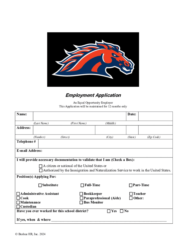 Employment ApplicationAn Equal Opportunity Employer This Application will be maintained for 12 months onlyName:Date: (Last Name)(First Name)(Middle)Address: (Number)(Street)(City)(State)(Zip Code)Telephone # Email Address: I will provide necessary documentation to validate that I am (Check a Box): A citizen or national of the United States or Authorized by the Immigration and NaturalizationService to work in the United States.Position(s) Applying For: SubstituteFullTimePartTimeAdministra
