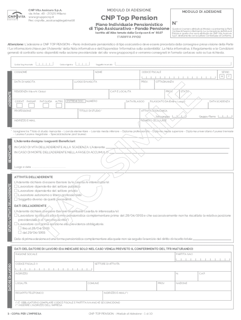 PEC cnpvita_assicura@legalmail.itMODULO DI ADESIONEMODULO DI ADESIONECNP Top Pension NFS