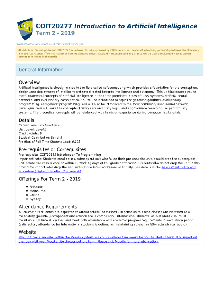 COIT20277 is a pivotal course focusing on the intersection of artificial intelligence and form design. It serves as an introductory framework for students and professionals who aspire to harness AI technologies in practical applications. This course is essential for anyone looking to understand the landscape of artificial intelligence, specifically how forms—structured inputs for data gathering—are evolving through AI integrations.