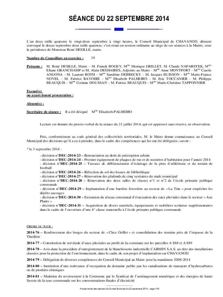 SANCE DU 22 SEPTEMBRE 2014 Lan deux mille quatorze le vingtdeux septembre vingt heures, le Conseil Municipal de CHAVANOD, dment convoqu le douze septembre deux mille quatorze, sest runi en session