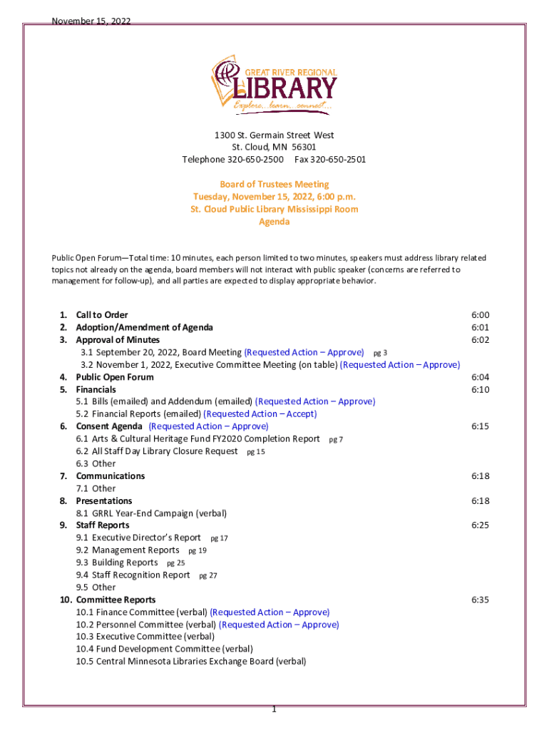 November 15, 20221300 St. German Street West St. Cloud, MN 56301 Telephone 3206502500 Fax 3206502501 Board of Trustees Meeting Tuesday, November 15, 2022, 6:00 p.m. St. Cloud Public Library Mississippi