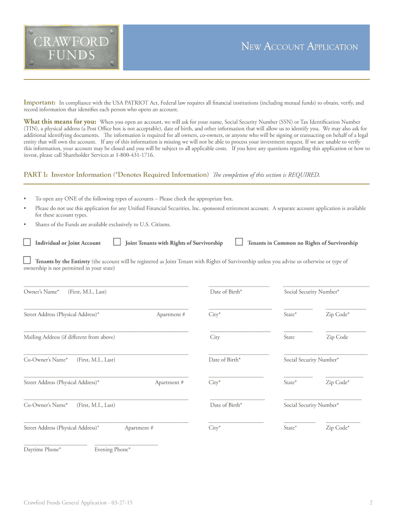NOTE: Do not use this application to open any Unified Financial Securities- sponsored retirement account. ... Crawford Funds General Application 03-27-. . 1 ...