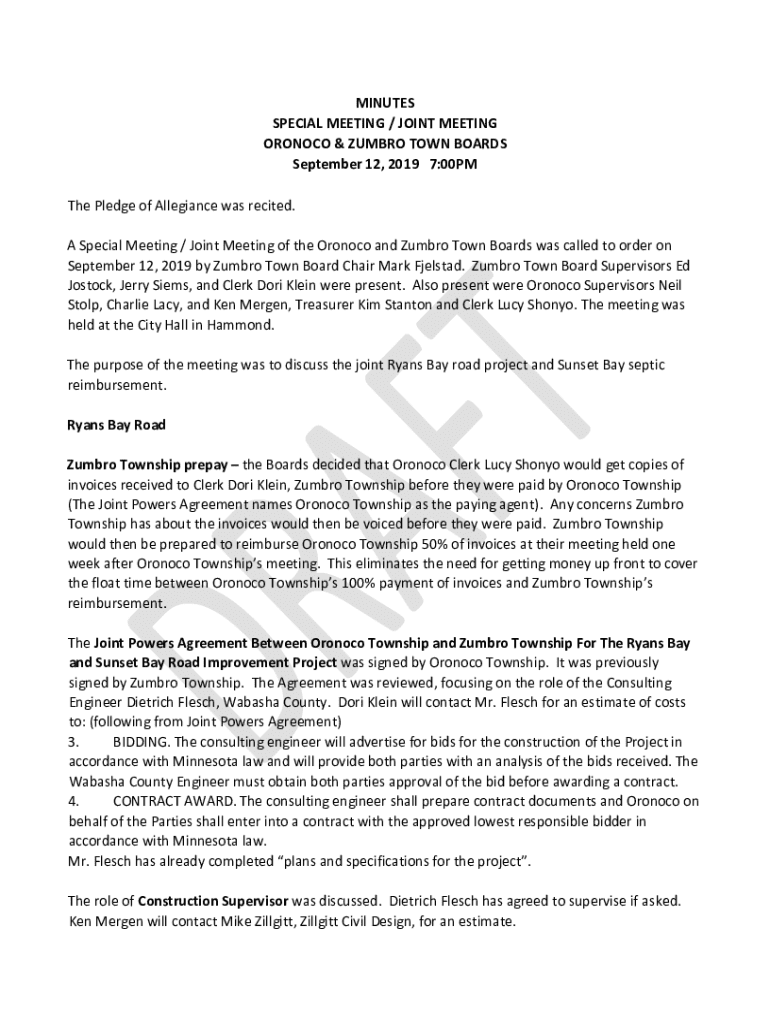 MINUTES SPECIAL MEETING / JOINT MEETING ORINOCO & JUMBO TOWN BOARDS September 12, 2019 7:00PM The Pledge of Allegiance was recited. A Special Meeting / Joint Meeting of the Orinoco and Jumbo Town