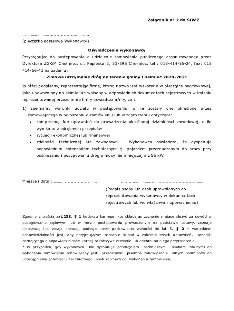 Zacznik nr 2 do SIWZ.................... (piecztka adresowa Wykonawcy) Owiadczenie wykonawcy Przystpujc do postpowania o udzielenie zamwienia publicznego organizowanego przez Dyrektora ZGKiM Chemiec,