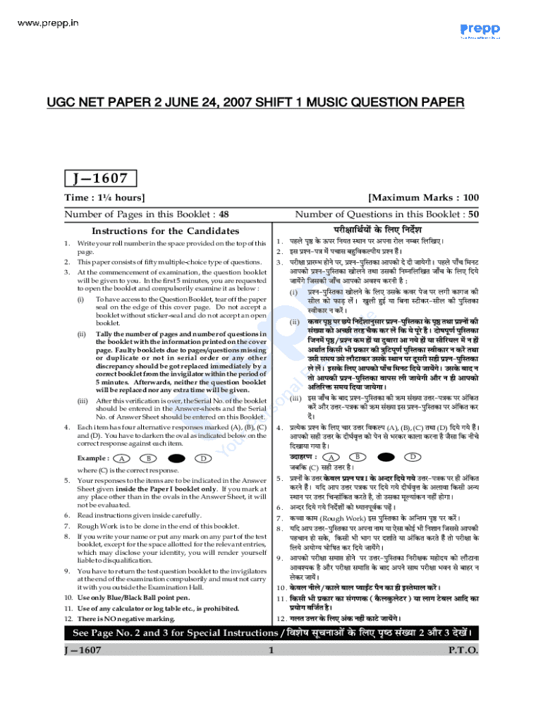UGC NET PAPER 2 JUNE 24, 2007, SHIFT 1 MUSIC QUESTION PAPERJ1 6 0 7 Time : 1 hours][Maximum Marks : 100Number of Pages in this Booklet : 48Number of Questions in this Booklet : 50U Instructions for