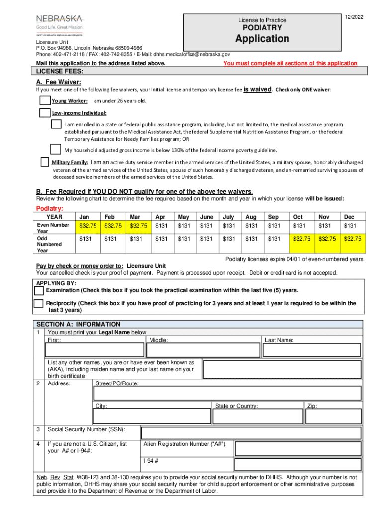 NE DHHS Application Information Podiatry License 2022-2026 free printable template