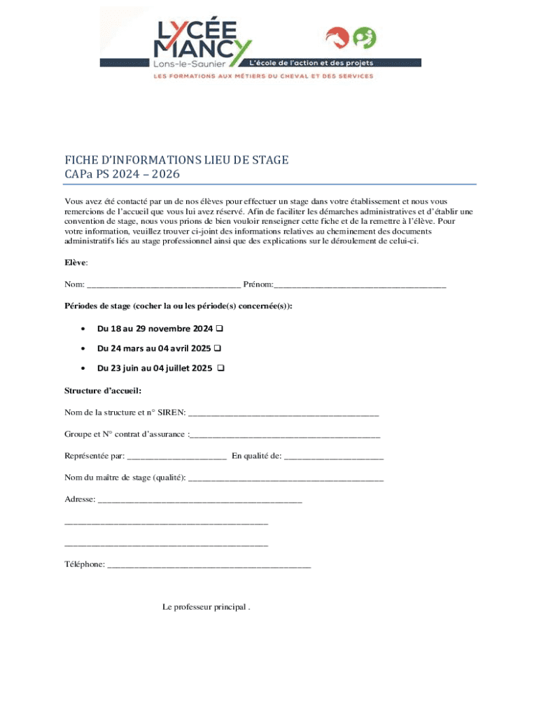 FICHE DINFORMATIONS LIEU DE STAGE CAPa PS 2024 2026 Vous avez t contact par un de nos lves pour effectuer un stage dans votre tablissement et nous vous remercions de laccueil que vous lui avez rserv.