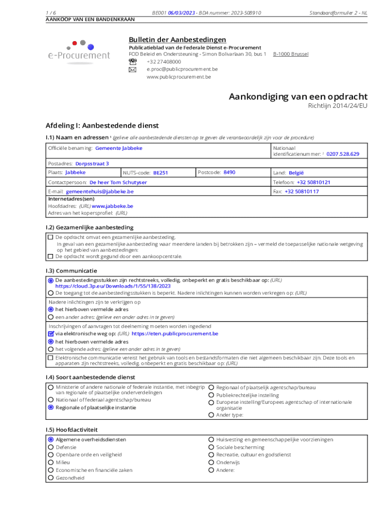 MANHOOD VAN BEEN BANDENKRAANBE001 06/03/2023 BDA number: 2023508910Standaardformulier 2 Bulletin her Aanbestedingen