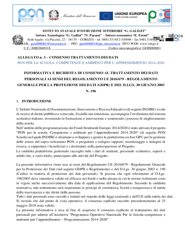 ISTITUTO STATALE DISTRUZIONE SUPERIORE G. GALILEI Settore Tecnologico G. Galilei N. Pacassi Settore economico E. Fermi Sede legale: via Puccini, 22 34170 GORIZIA tel. 0481.531452530048 fax 0481.534955