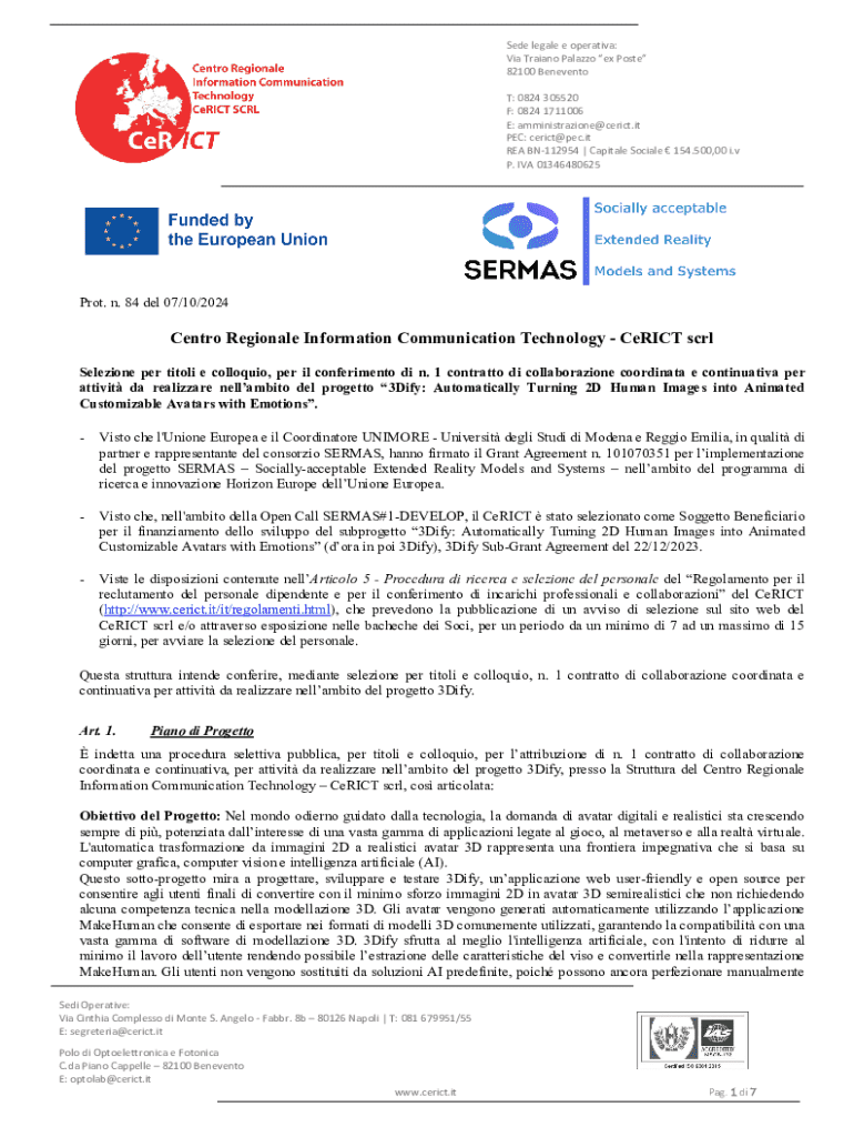 See legal e operative: Via Train Palazzo ex Post 82100 Benedetto T: 0824 305520 F: 0824 1711006 E: amministrazione@cerict.it PEC: cerict@pec.it REA BN112954 | Capital Social 154,500.00 i.v P. IVA
