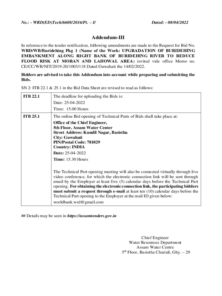 No.: WRD(ED)Tech/6608/2016/Pt. I/Dated: 08/04/2022AddendumIII In reference to the tender notification, following amendments are made to the Request for Bid No. WRD/WB/Buridehing Pkg 1 (Name of the Work: UPGRADATION OF BURIDEHING EMBANKMENT ALONG RIGHT BANK OF BURIDEHING RIVER TO REDUCE FLOOD RISK AT MORAN AND LAHOWAL AREA) invited vide office Memo no. CE/CC/WR/NIT/201920/1003/118 Dated Guwahati the 14/02/2022. Bidders are advised to take this Addendum into account while preparing and...