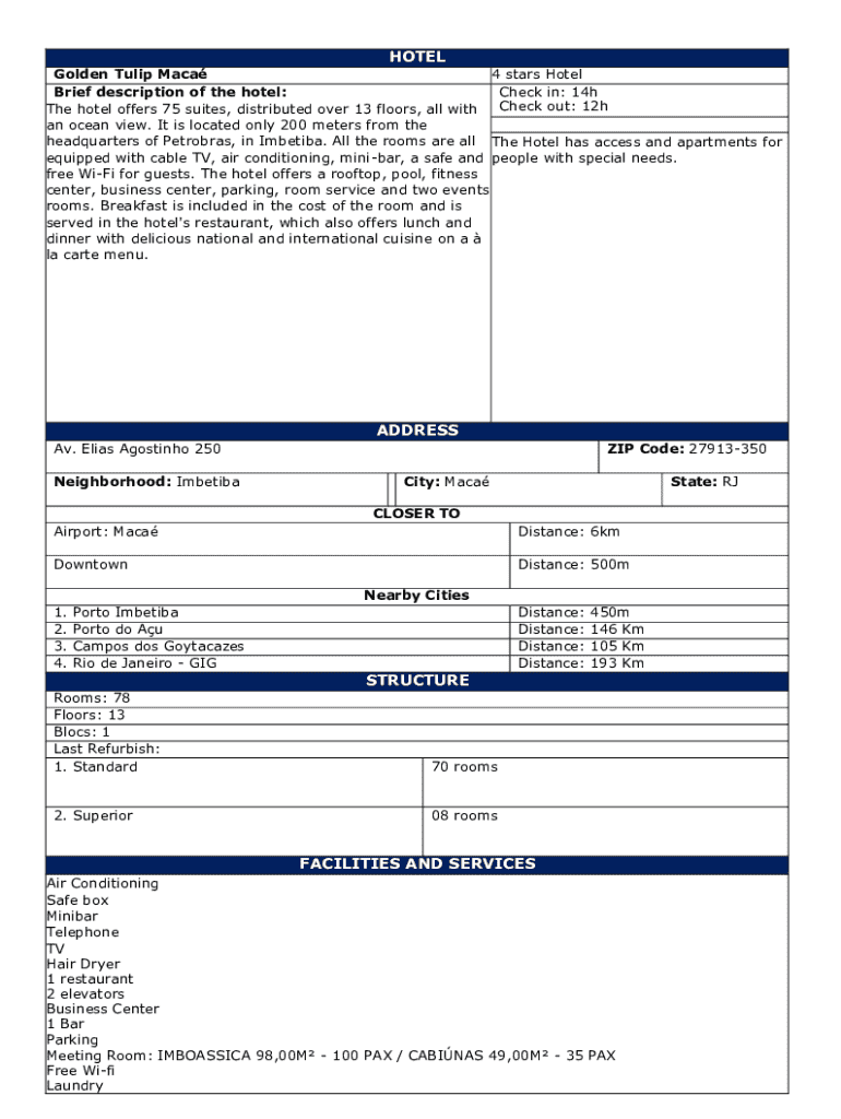 HOTEL Golden Tulip Mac 4 stars Hotel Check in: 14h Brief description of the hotel: Check out: 12h The hotel offers 75 suites, distributed over 13 floors, all with an ocean view. It is located only