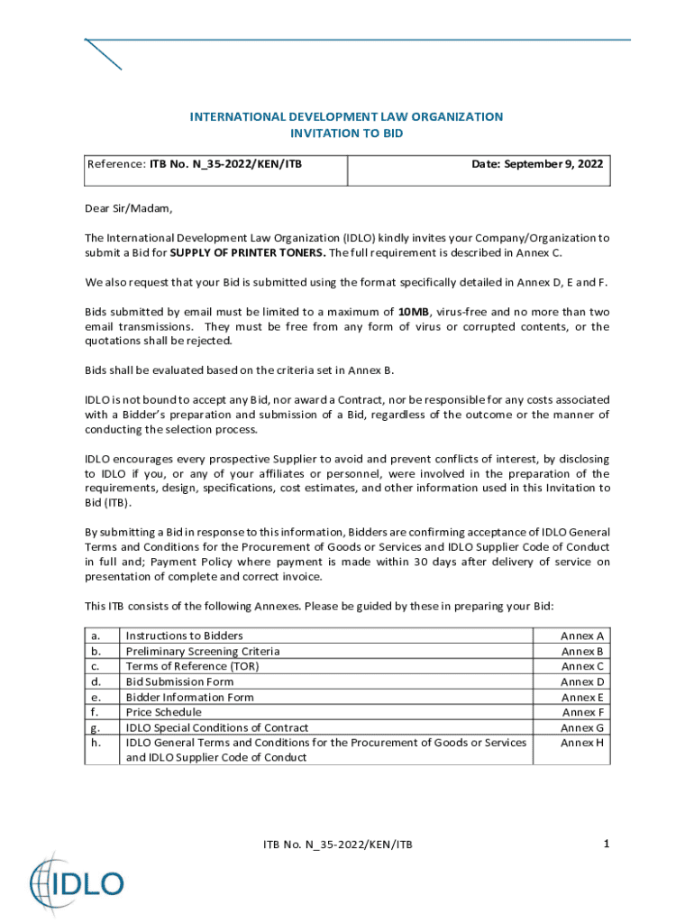INTERNATIONAL DEVELOPMENT LAW ORGANIZATION INVITATION TO BID Reference: ITB No. N_352022/KEN/ITBDate: September 9, 2022Dear Sir/Madam, The International Development Law Organization (IDLO) kindly invites your Company/Organization to submit a Bid for SUPPLY OF PRINTER TONERS. The full requirement is described in Annex C. We also request that your Bid is submitted using the format specifically detailed in Annex D, E and F. Bids submitted by email must be limited to a maximum of 10MB, virusfree...