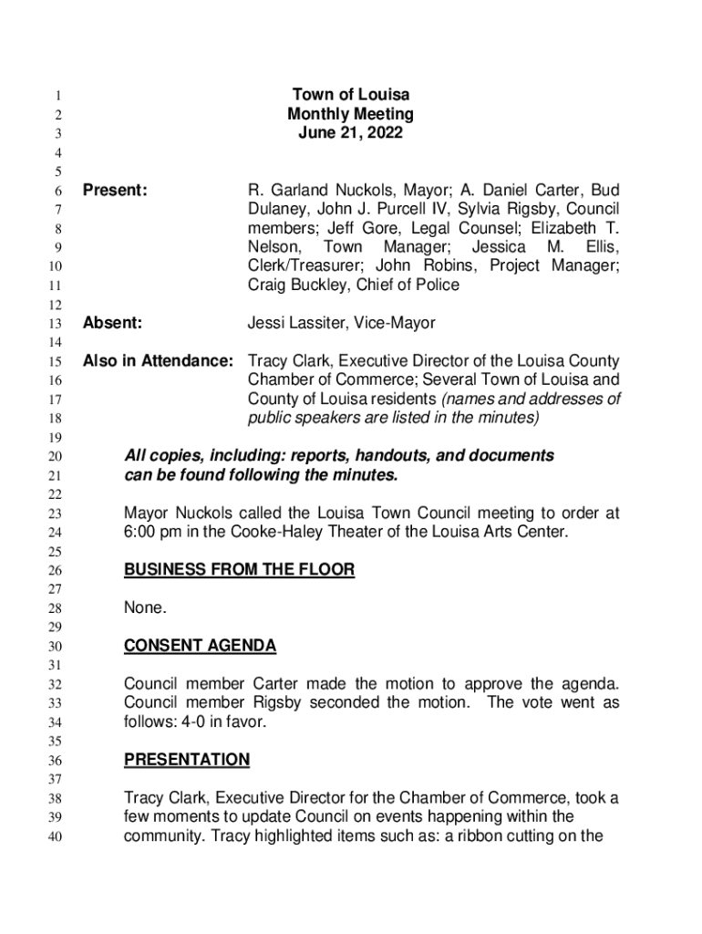 1 2 3 4 5 6 7 8 9 10 11 12 13 14 15 16 17 18 19 20 21 22 23 24 25 26 27 28 29 30 31 32 33 34 35 36 37 38 39 40Town of Louisa Monthly Meeting June 21, 2022Present:R. Garland Nuckols, Mayor; A. Daniel Carter, Bud Dulaney, John J. Purcell IV, Sylvia Rigsby, Council members; Jeff Gore, Legal Counsel; Elizabeth T. Nelson, Town Manager; Jessica M. Ellis, Clerk/Treasurer; John Robins, Project Manager; Craig Buckley, Chief of PoliceAbsent:Jessi Lassiter, ViceMayorAlso in Attendance: Tracy Clark,