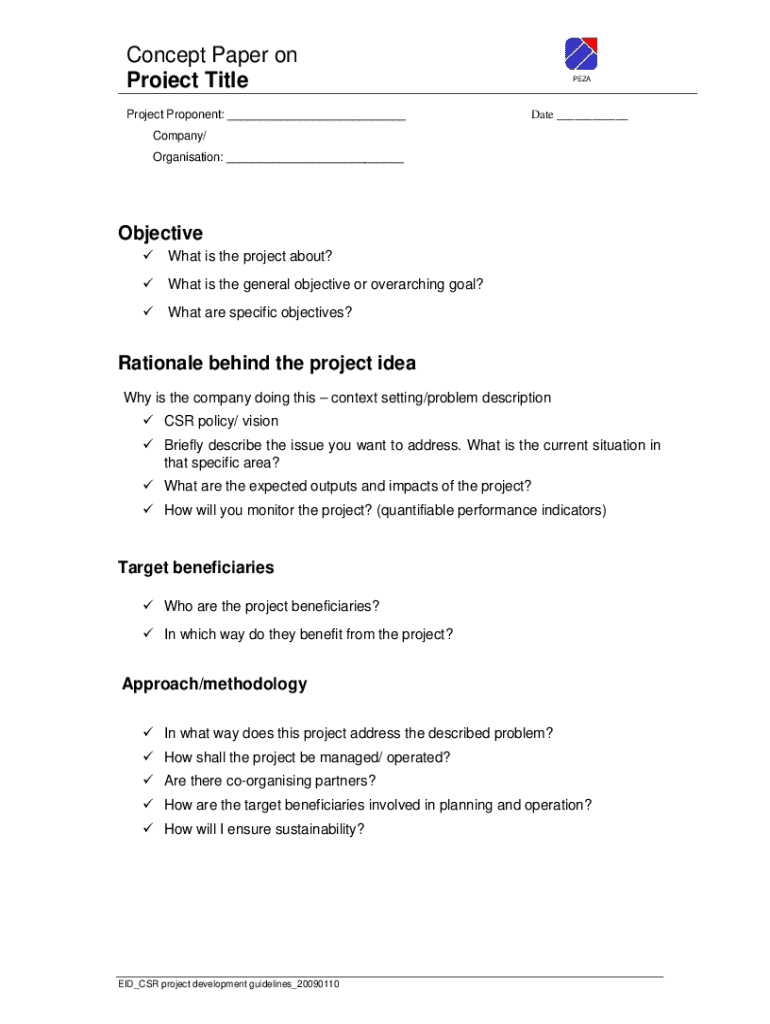 Concept Paper on Project Title Project Proponent: ___Separate ___Company/ Organization: ___Objective 9 What is the project about? 9 What is the general objective or overarching goal? 9 What are specific