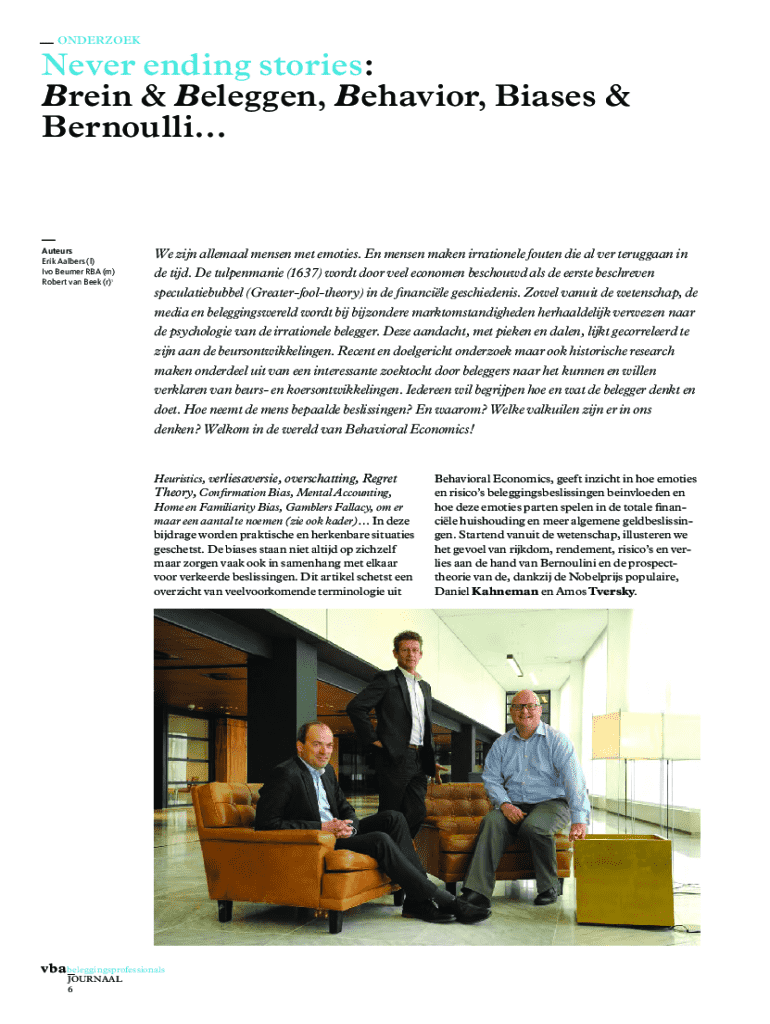 ONDERZOEKNever ending stories: Brein & Beleggen, Behavior, Biases & BernoulliAuteurs Erik Aalbers (l) Ivo Beumer RBA (m) Robert van Beek (r)1We zijn allemaal mensen met emoties. En mensen maken irrationele