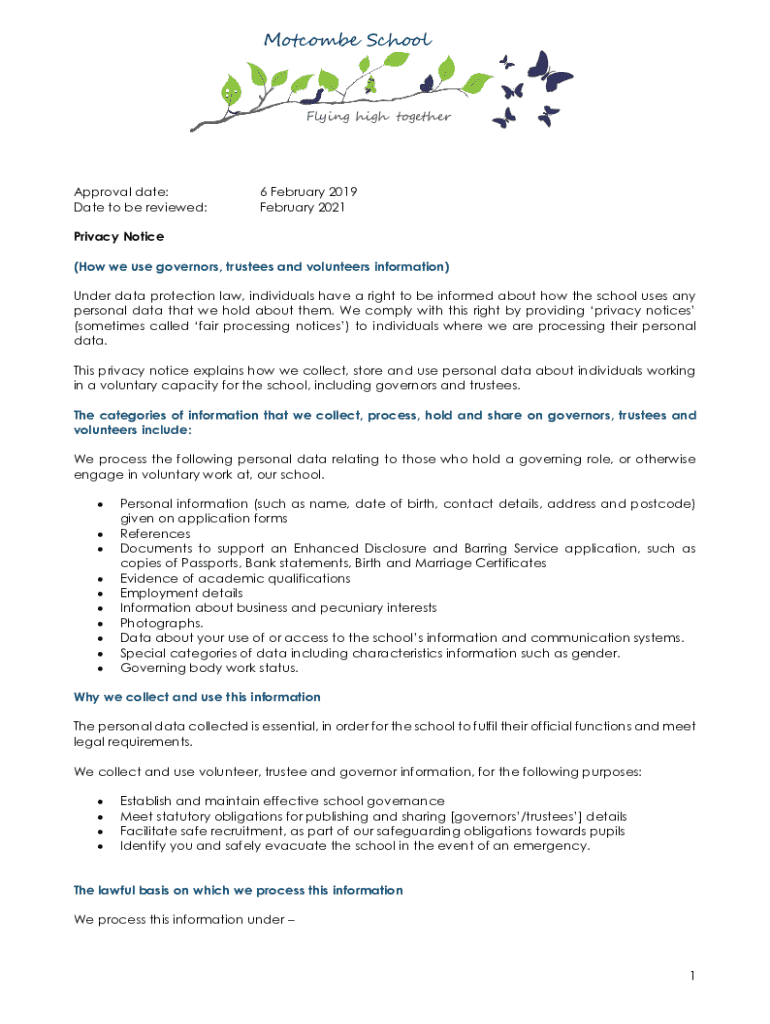 Motcombe SchoolFlying high togetherApproval date: Date to be reviewed:6 February 2019 February 2021Privacy Notice (How we use governors, trustees and volunteers information) Under data protection