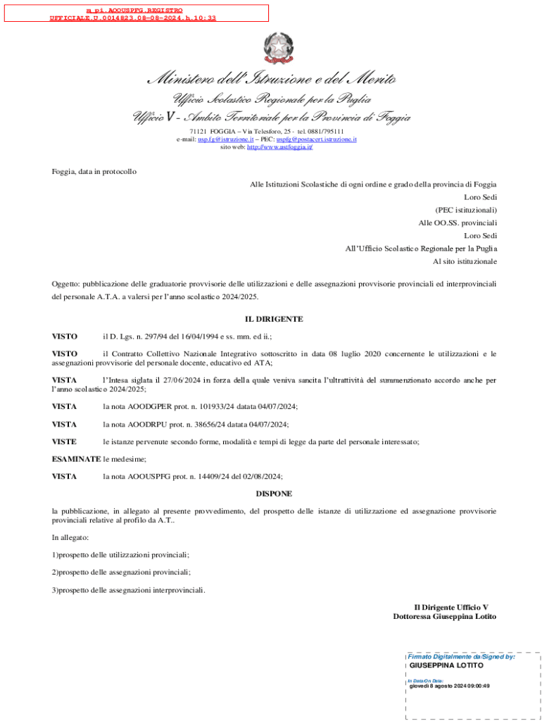 ___ m_pi.AOOUSPFG.REGISTRO UFFICIALE.U.0014823.08082024.h.10:33 ___Ministero dellIstruzione e del Merito Ufficio Scolastico Regionale per la Puglia Ufficio V Ambito Territoriale per la Provincia di