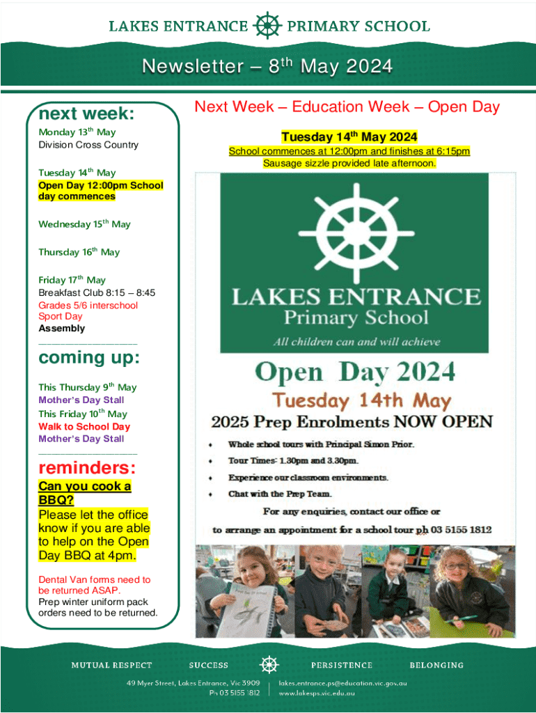 Newsletter 8 th May 2024 next week: Monday 13th May Division Cross Country Tuesday 14th May Open Day 12:00pm School day commences Wednesday 15th May Thursday 16th May Friday 17th May Breakfast Club
