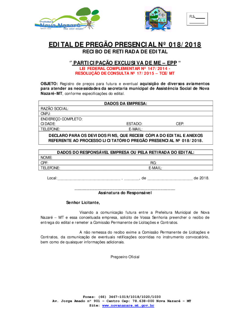 EDITAL DE PREGO PRESENCIAL N 018/2018 RECIBO DE RETIRADA DE EDITAL PARTICIPAO EXCLUSIVA DE ME EPP LEI FEDERAL COMPLEMENTAR N 147/2014 RESOLUO DE CONSULTA N 17/2015 TCE/MT OBJETO: Registro de preos